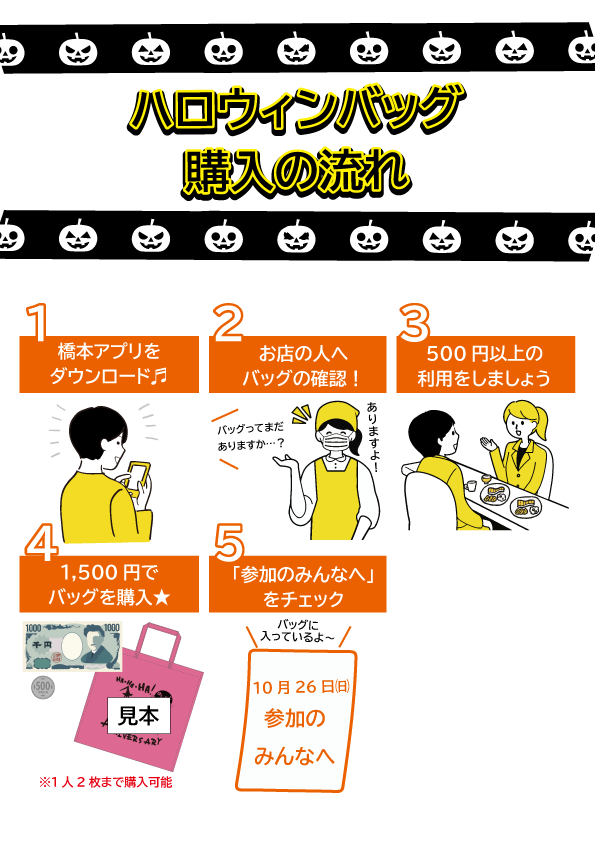 ※専用ハロウィンバッグの販売店やその他情報については、橋本アプリ内のみにてアップとなります。必ずアプリをダウンロードしてご確認ください。
