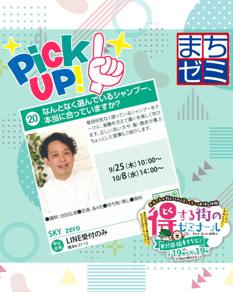 第15回橋本まちゼミ【 PICKUP 講座のお知らせ】 2025年9月26日 管理者 イベント情報, まちゼミ さて! 第15回橋本まちゼミには、様々な学びが出来る、講座がございます! 今回は、pick upと題して、募集中の講座をご紹介✨ 講 座:20 題 名:なんとなく選んでいるシャンプー、本当に合っていますか? 店 名:SKY zero 募集日:10月8日 ■店舗より 普段何気なく使っているシャンプーをテーマに、実験を交えて違いを楽しく学びます。 正しい洗い方や、髪・頭皮が喜ぶちょっとした習慣もご紹介します。 ※受講をご希望の方は店舗へお問い合わせください。