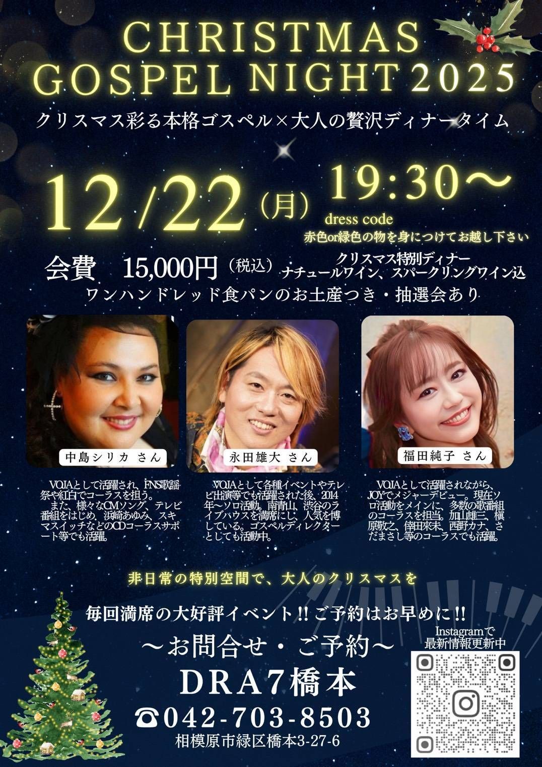3名のスペシャルゴスペルライブが、聖夜をドラマチックに彩ります。