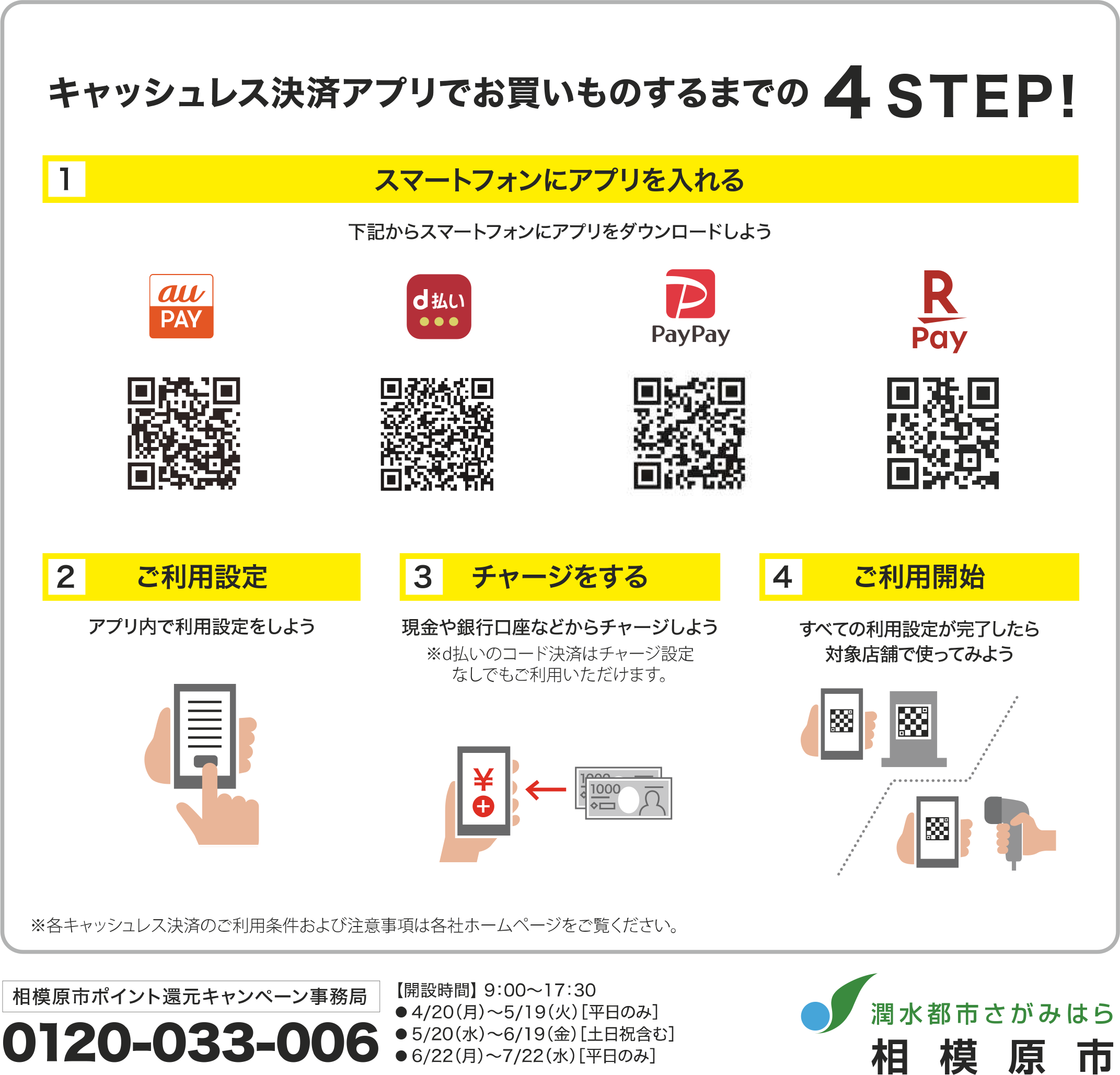 【お問い合わせ先】 相模原市ポイント還元キャンペーン事務局 TEL:0120-033-006 受付時間:9:00-17:30 ※~5/19[平日のみ]、5/20~6/19[土日祝含む]、6/22~7/22[平日のみ]
