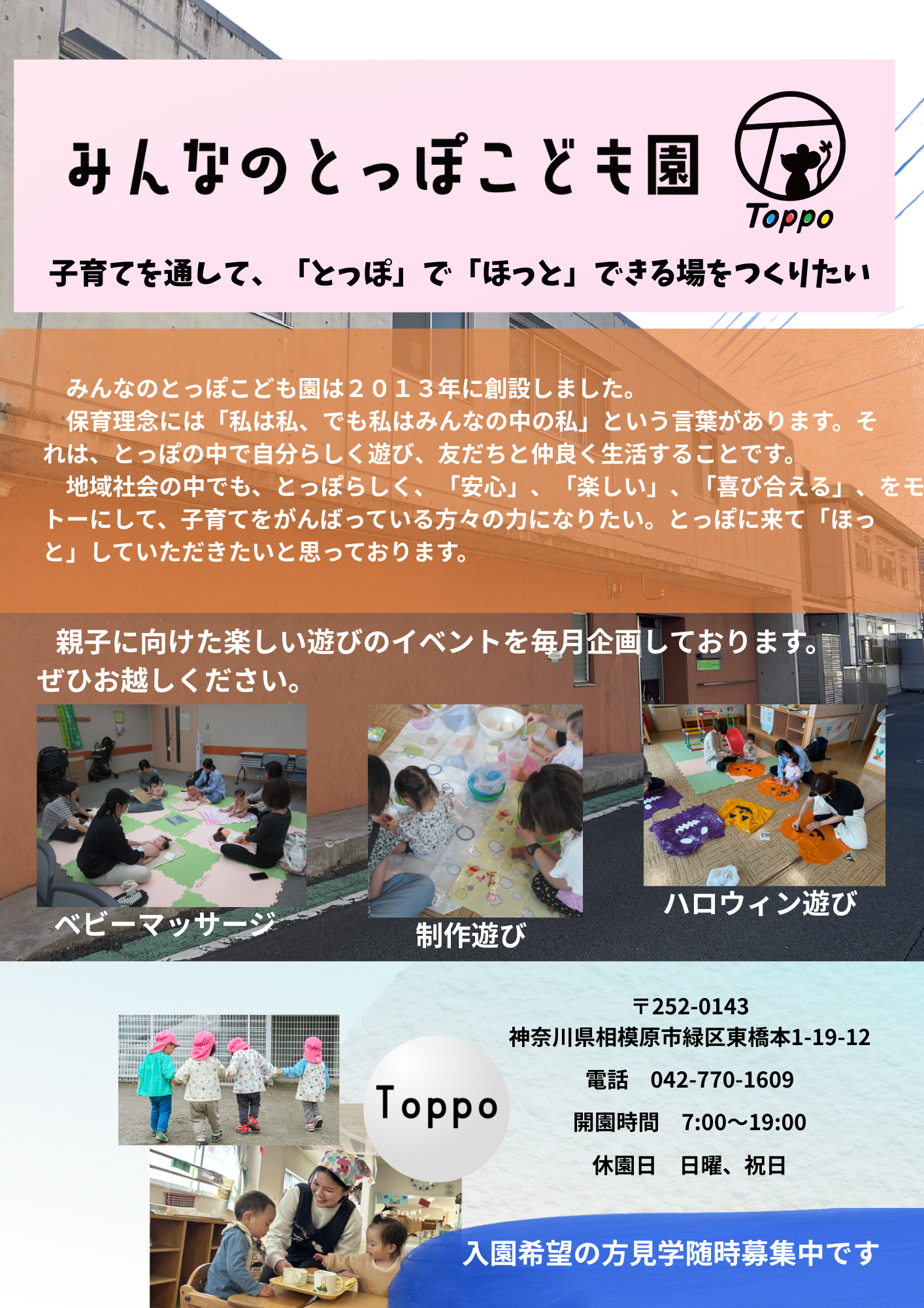 地域社会の中でも、とっぽらしく、「安心」、「楽しい」、「喜び合える」、をモットーにして、子育てをがんばっている方々の力になりたい。